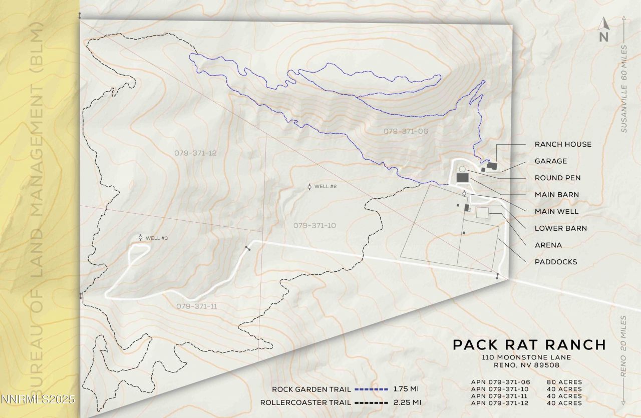 A once-in-a-lifetime 200-acre legacy ranch in Red Rock, where rugged wilderness meets refined Western living. This private holding captures the essence of Nevada's open range-rolling hills, panoramic vistas, and miles of trails that begin right off your back porch. Comprising four contiguous parcels, the property's western boundary adjoins over 50,000 acres of BLM land, offering direct and unrestricted access to the Sand Hills and Peterson Wilderness-a vast and untamed expanse ideal for trail riding, hiking, and exploring Nevada's backcountry in pure solitude. The ranch-style residence crowns an elevated ridge with sweeping, cinematic views in every direction. Completely reimagined in 2016, the home blends rustic craftsmanship with understated luxury-featuring Aries Brothers cabinetry, leathered granite counters, Wolf, Miele and Zephyr appliances, a true cast iron clawfoot tub, and real hardwood flooring throughout. Custom built-ins accent each room, and a Jotul wood-burning fireplace with a reclaimed timber mantle from the Davis Creek Ranch anchor the great room, while every window frames an ever-changing visual masterpiece - Sand Hills and Peterson Mountain Wilderness, the Dog Skins and Virginia Peak, Fred's Mountain, and even down to Sonora Pass along the sweeping Eastern Sierra front - almost 120 miles! The equestrian compound is purpose-built for those who ride, train, or simply live the lifestyle. A custom six-stall cedar barn showcases handcrafted ironwork designed for durability and beauty. A secondary barn provides two additional stalls, hay and equipment storage, and a wash rack. The professional-grade 90' x 90' arena and round pen-each built with reclaimed oil field piping and deep concrete footers-are designed to handle serious use. Two custom single-track, multi-use trails of 4.5 miles wind through the property. Rollercoaster trail ascends to the property summit with stunning views back onto the home and barns and up into the exquisite rocks of the Sand Hills. Rock Garden trail explores quartz-laced, wind-carved boulders, and summits the iconic property mesa with 360-degree views of colorful mountains and sweeping valleys unlike anywhere else in Northern Nevada. For the discerning buyer seeking adventure, privacy, majestic scenery, and connection to the land, this property offers it all-breathtaking sunrises and Alpen-glow sunsets, crisp snow-capped horizons, and endless adventure by horseback, mountain bike, on foot or on side-by-side. Just 20 minutes from town, yet it feels a world apart-an authentic Nevada sanctuary, truly one of a kind. 4 Parcel IDs : 079-371-06, 079-371-10, 079-371-11, 079-371-12