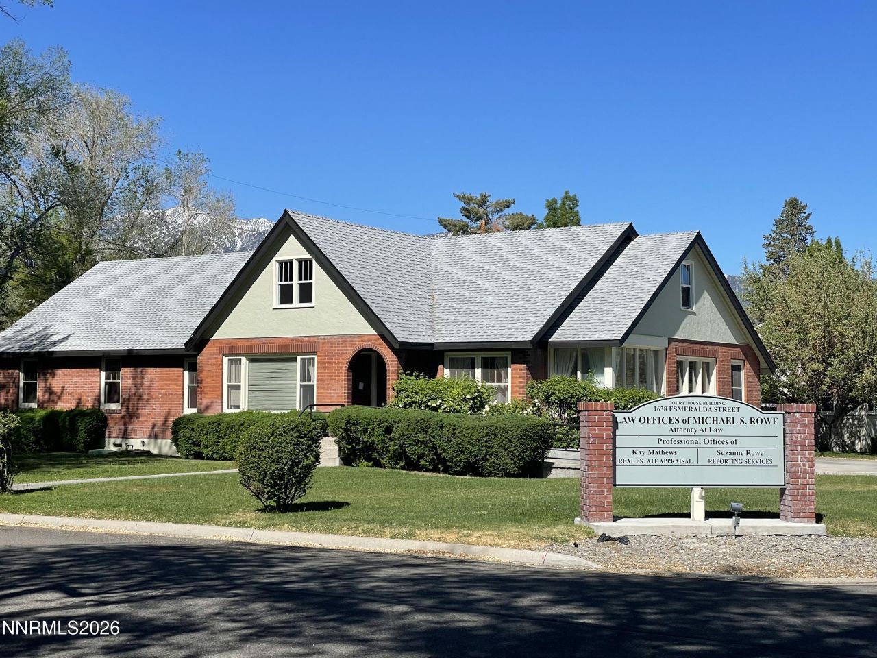 Lease the entire building or individual office suites. Garage/workshop of 1,264 sq. ft. is also available for lease. Beautiful historic office building recently remodeled with new vinyl plank flooring and recessed lights, located on the high traffic corner of Esmeralda and Ninth Street, near the Minden Post Office, Douglas County Offices and just one block from Hwy 395. Previously a law office, this building offers a front entry area, 8 offices, conference room, breakroom, two restrooms, basement office/storage, attic storage and two car garage. Four offices can be adjoining. Prominent monument signage available. On and off street parking. High speed fiber optic internet and phone.