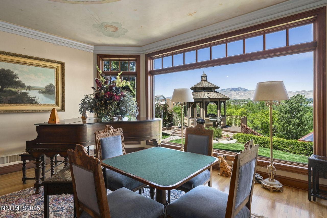 Make Reno's history into your future at 745 California Avenue, a 7,722 sq ft, 6 bd/5.5 bath English Tudor Revival home. Known as the Payne House and designed in the late 1930s, it features a 20-foot circular entry hall connecting formal and cozy living areas. Its prime location offers stunning views of the Truckee River and downtown Reno through expansive windows, a terraced yard, and a gazebo. With its rich history, detailed restoration, and modern amenities, this house is ready for its next era and owner.Discover a distinctive property that blends architecture and history on Reno's iconic bluff overlooking the Truckee River at 745 California Avenue. This 7,722 sq ft English Tudor Revival estate was designed in the late 1930s by famed Nevada architect Edward Parsons, who called it rather a thrill. The home makes a lasting impression with decorative brickwork, half-timbering, steeply pitched symmetrical gables, leaded glass windows, and massive chimneys. Its form is most striking from above, where terraced gardens and mature trees blend seamlessly into the home's architecture, offering privacy, beauty, and a deep sense of permanence.More than 50 years after its construction, the Payne House's current owner undertook a thoughtful restoration. Key original features-hardwood flooring, hand-finished brickwork, and bespoke architectural details-were preserved. Modern upgrades include central air conditioning, forced-air gas heating, updated plumbing and electrical systems, and security. A restored vintage elevator provides convenient access across all levels of the home.The home includes 6 bedrooms and 5.5 bathrooms. The primary suite features a vintage fireplace, mountain views, dual vanities, a jetted soaking tub, a walk-in shower, and a spacious closet.The kitchen pairs classic charm with modern function, with built-in appliances and a garden-view breakfast nook. The formal dining room features oversized windows that frame panoramic views of the Truckee River and Sierra foothills. A painted ceiling mural floats above the living and game room. Wood-burning and freestanding fireplaces add warmth and character throughout the home.Additional rooms include a library, office, bonus space, and a fully finished walk-out basement with its own recreation area and workshop. The finished basement opens to the yard and adds flexible space for hobbies, guests, or extra living.The 0.79-acre lot includes a custom stone wall along California Avenue, a private driveway, a detached two-car garage, and a playhouse designed to echo the main residence. A tranquil pond anchors the front yard, while the terraced backyard unfolds to a deck, patio, and a gazebo perched above the river-perfect for gatherings, balloon watching, or quiet river moments.Located about a mile from downtown Reno, the home offers convenient access to parks, schools, and cultural venues. The Newlands Historic District is known for its concentration of other historic homes, tree-lined streets, and a landscape shaped by the City Beautiful movement.The Payne House offers more than architectural beauty-it holds a story. From its distinguished origins to its careful restoration, this home reflects vision, character, and legacy. It's ready for its next era-and for someone who values history, design, and the timeless experience of living in a truly remarkable place.